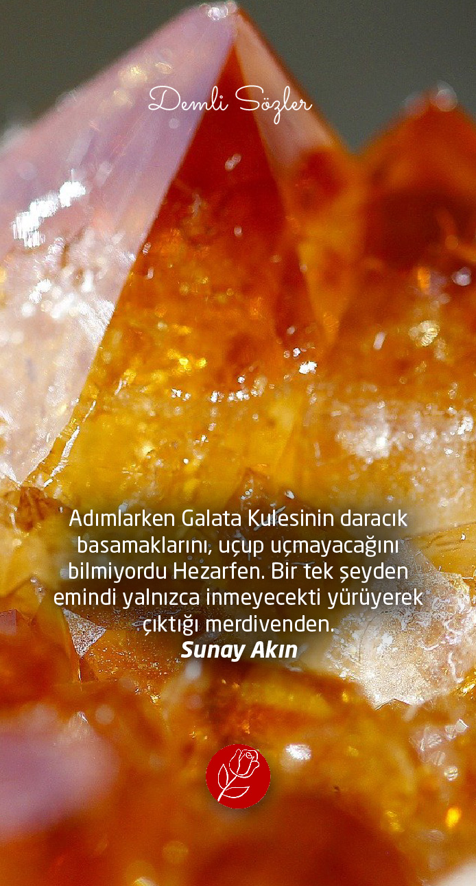 "Adımlarken Galata Kulesinin daracık basamaklarını, uçup uçmayacağını bilmiyordu Hezarfen. Bir tek şeyden emindi yalnızca inmeyecekti yürüyerek çıktığı merdivenden."