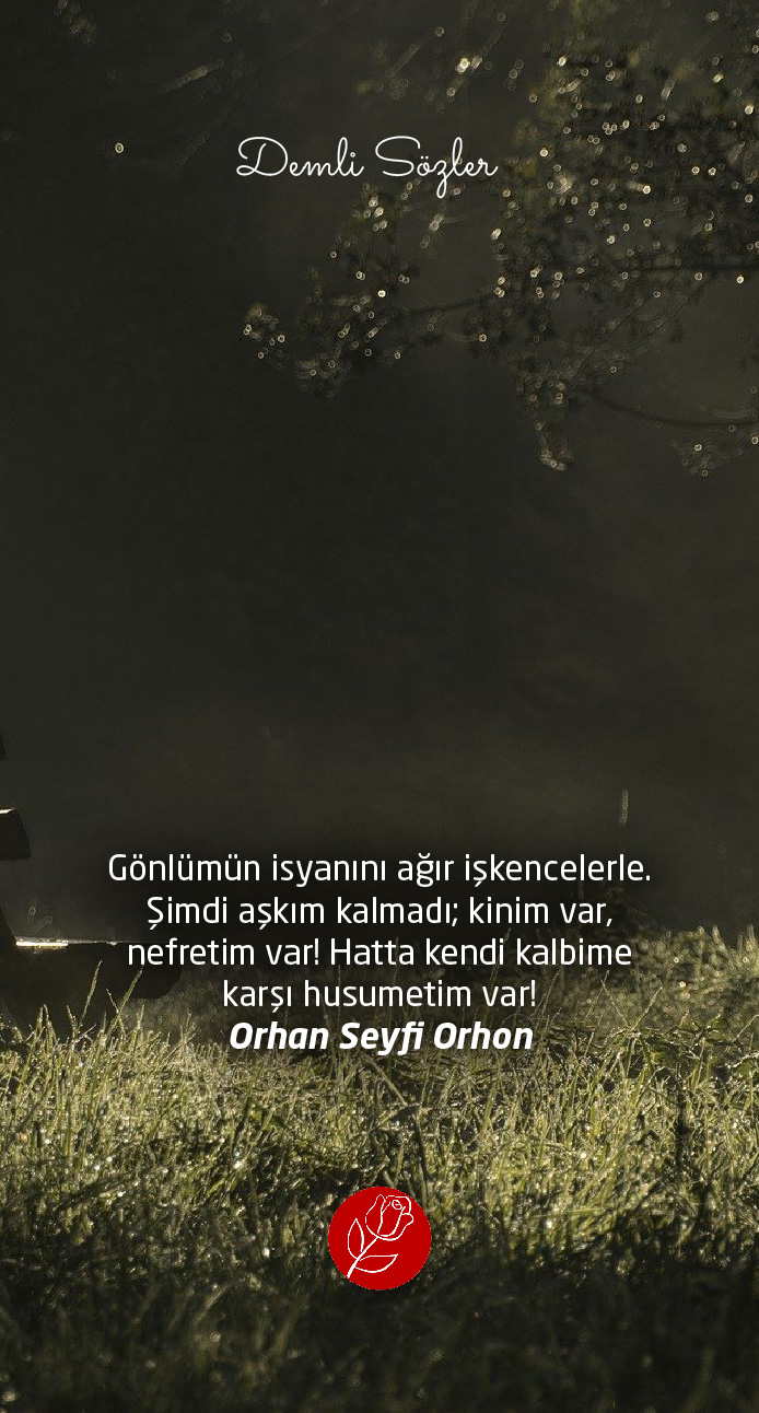 "Gönlümün isyanını ağır işkencelerle. Şimdi aşkım kalmadı; kinim var, nefretim var! Hatta kendi kalbime karşı husumetim var!"