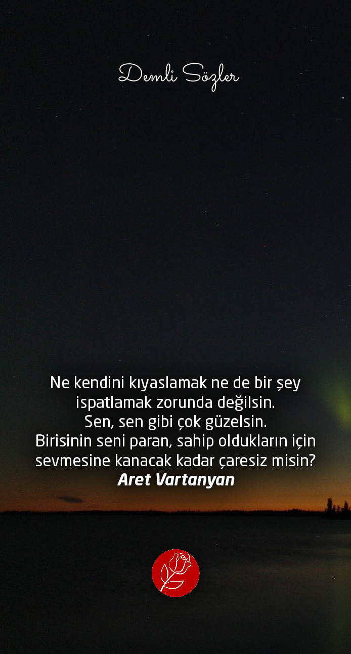 "Ne kendini kıyaslamak ne de bir şey ispatlamak zorunda değilsin. Sen, sen gibi çok güzelsin. Birisinin seni paran, sahip oldukların için sevmesine kanacak kadar çaresiz misin? "