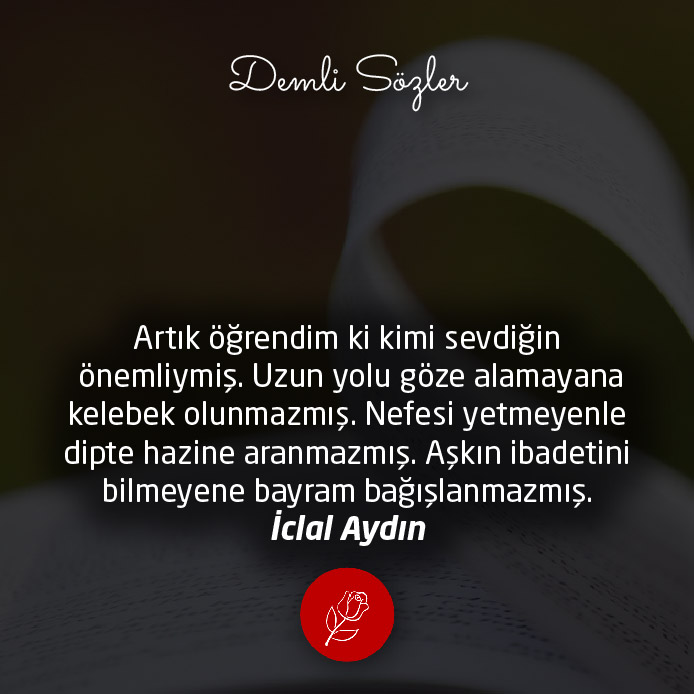 "Artık öğrendim ki kimi sevdiğin önemliymiş. Uzun yolu göze alamayana kelebek olunmazmış. Nefesi yetmeyenle dipte hazine aranmazmış. Aşkın ibadetini bilmeyene bayram bağışlanmazmış. "