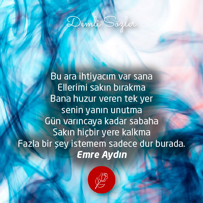 "Bu ara ihtiyacım var sana. Ellerimi sakın bırakma. Bana huzur veren tek yer senin yanın unutma . Gün varıncaya kadar sabaha. Sakın hiçbir yere kalkma. Fazla bir şey istemem sadece dur burada."