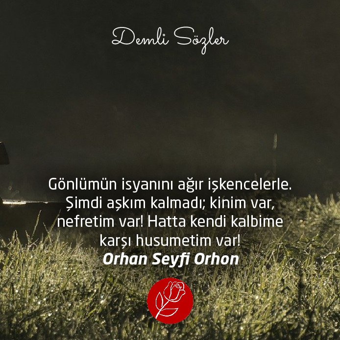 "Gönlümün isyanını ağır işkencelerle. Şimdi aşkım kalmadı; kinim var, nefretim var! Hatta kendi kalbime karşı husumetim var!"