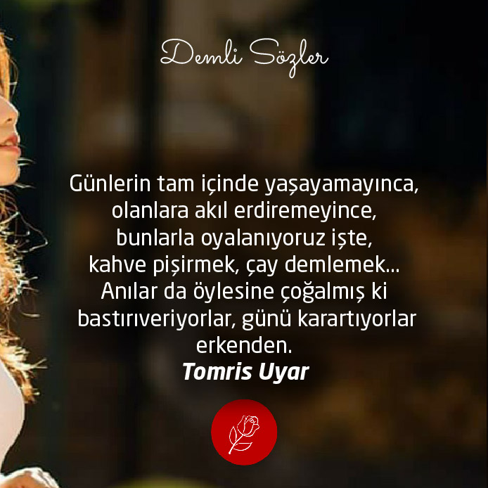 "Günlerin tam içinde yaşayamayınca, olanlara akıl erdiremeyince, bunlarla oyalanıyoruz işte, kahve pişirmek, çay demlemek... Anılar da öylesine çoğalmış ki bastırıveriyorlar, günü karartıyorlar erkenden."