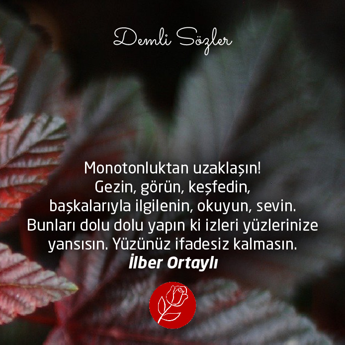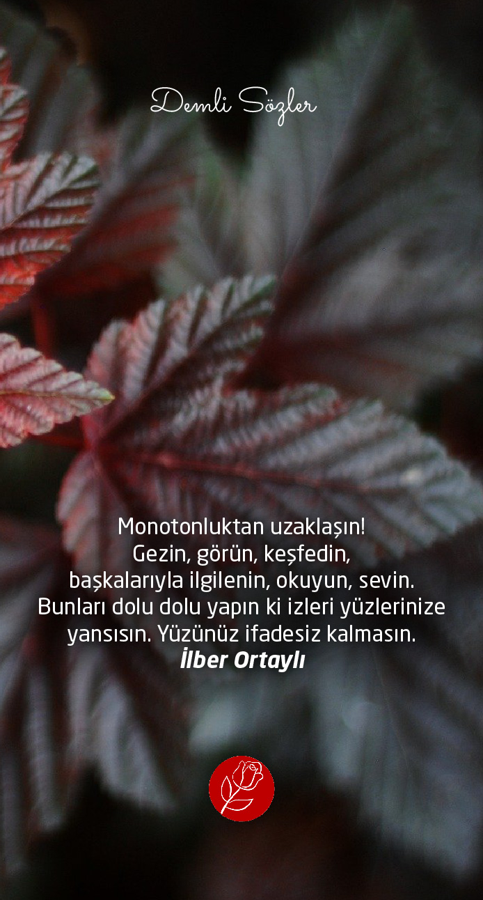 "Monotonluktan uzaklaşın! Gezin, görün, keşfedin, başkalarıyla ilgilenin, okuyun, sevin. Bunları dolu dolu yapın ki izleri yüzlerinize yansısın. Yüzünüz ifadesiz kalmasın."