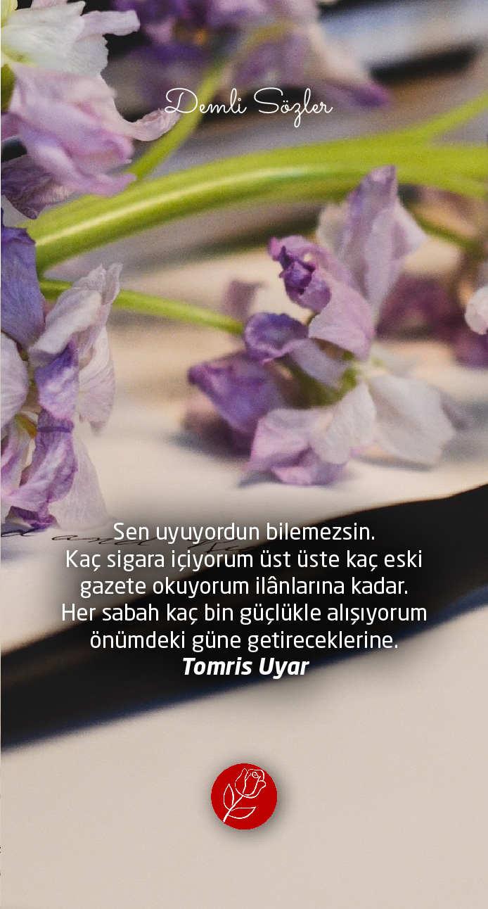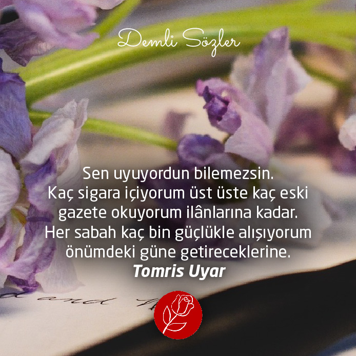 "Sen uyuyordun bilemezsin. Kaç sigara içiyorum üst üste kaç eski gazete okuyorum ilânlarına kadar. Her sabah kaç bin güçlükle alışıyorum önümdeki güne getireceklerine."