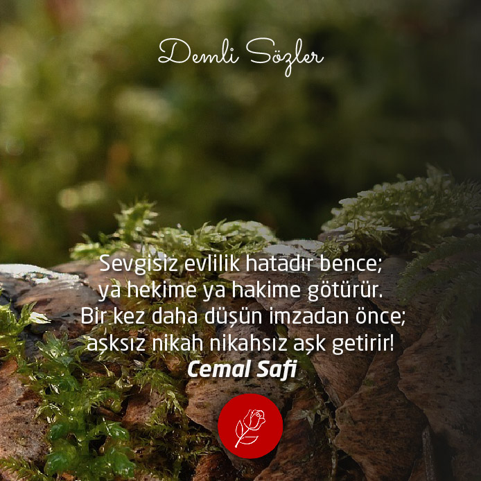 "Sevgisiz evlilik hatadır bence; ya hekime ya hakime götürür. Bir kez daha düşün imzadan önce; aşksız nikah nikahsız aşk getirir!"