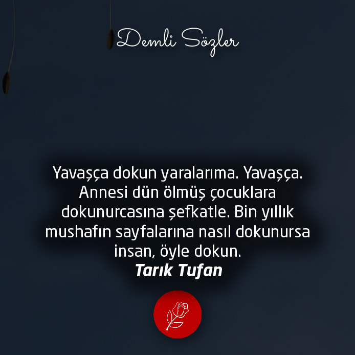 "Yavaşça dokun yaralarıma. Yavaşça. Annesi dün ölmüş çocuklara dokunurcasına şefkatle. Bin yıllık mushafın sayfalarına nasıl dokunursa insan, öyle dokun."